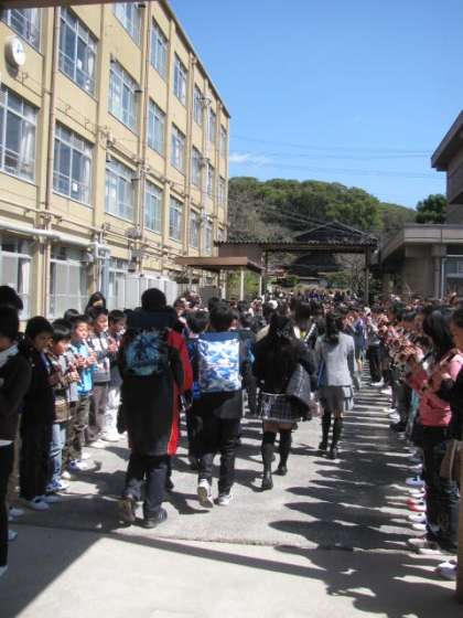 春の光り輝く今日3月21日,平成24年度卒業式を終えた121名の卒業生が,5年生のリコーダーの演奏に送られて,晴れやかに桃山小学校を巣立っていきました。