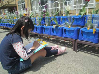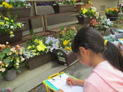 花びらをじっと見て絵を描いたり,様子をじっくりと見てていねいに文を書いたりすることができました。