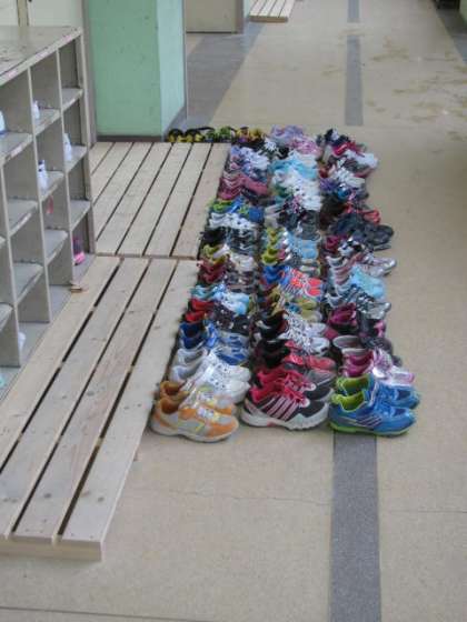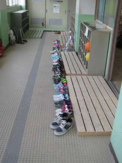 まず感心したのが,ろうかに脱ぎ揃えてあった靴です。全てというわけではありませんが,ほとんどの教室前できちんと美しく靴が脱いで置いてありました。