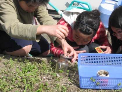 4月19日(金)2校時に中庭の花壇で6年生の子ども達のグループが理科実験をしていました。