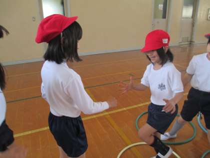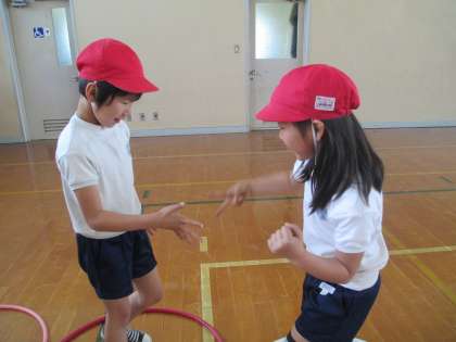 次に2人組になって,1つのフラフープを渡しあったり,2つのフラフープを渡したりしました。フラフープを追いかけて楽しく走ったり,友達と上手にできたことを喜んでいました。