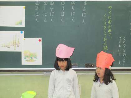 参観日に発表する「ふきのとう」の音読発表会に向けて,お面をつけて練習をしました。グループごとの発表をした後に,グループのいいところを発表しました。