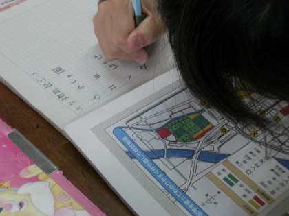 地図に「このあたりは○○が多い」「ここに△△がある」などを文字で表すのではなく,記号で表す学習を始めました。