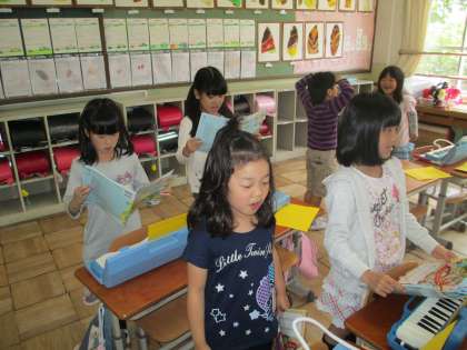 音楽ではけんばんハーモニカの練習と歌を歌っています。歌は「やまびこ」と「ジェットコースター」です。「山びこ」はかけあいのある歌なので,自分の好きなパートを元気よく歌っていました。「ジェットコースター」はとても元気な歌で,リズムのテンポがとてもいい曲です。今日は「ジェットコースター歌いたい!」と子どもたちからのリクエストで歌いました。楽しい雰囲気で歌うことができました。