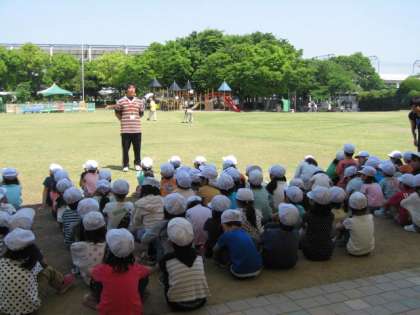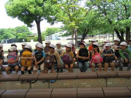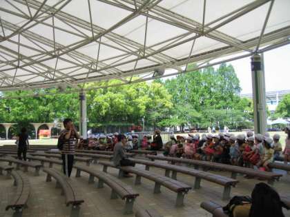 きょうは,暑すぎるくらいのいい天気でした。1年生は淀の「緑の広場」に行きました。京阪電車の駅では,とてもお行儀がよく校長先生にほめてもらいました。「緑の広場」に着くと,まだだれも来ていません。まずは,大きなテントの下で,八剱先生のお話を聞きました。聞き方もすばらしかったです。