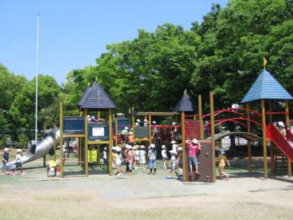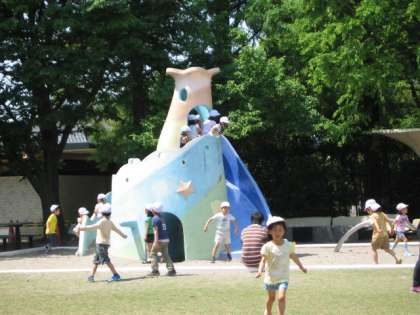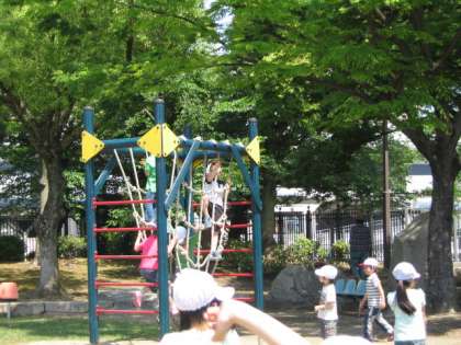 いよいよ「緑の広場」で遊び出しました。やはり1番に子ども達が遊び出したのは,アスレチックと滑り台です。目新しいので,ほとんどの人が遊びました。すずなりになって遊んでいました。なかよく遊んでいましたよ!