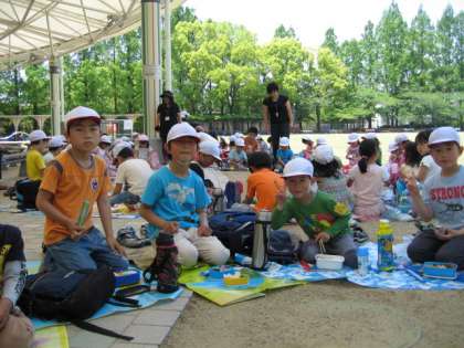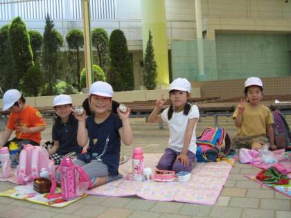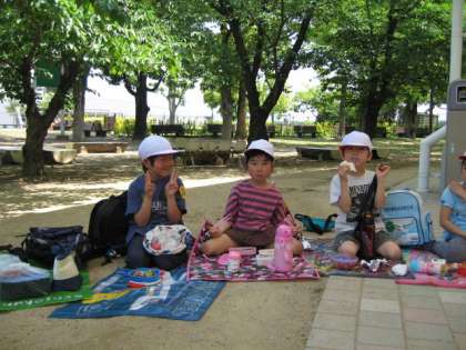 たっぷり2時間近く遊んだので,子ども達はおなかがぺこぺこです。11時頃から「ねえ、お弁当はまだ?」と尋ねてくる人がたくさん来ました。しっかり遊んだのでおなかが減ったようです。クラスごとに円になり,みんなで心のこもったお弁当をいただきました。あっという間に終わった人もいます。朝早くから,お弁当を作ってくださってありがとうございました!