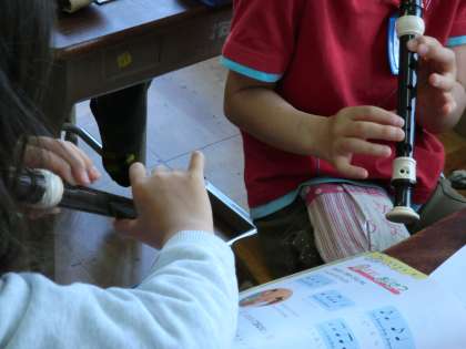学習を始めたてのリコーダー,持ち方や姿勢・あなのふさぎ方などにも随分慣れてきました。まだ「シ」の音だけではありますが,タンギングを意識しきれいな音色で吹けるよう練習しています。