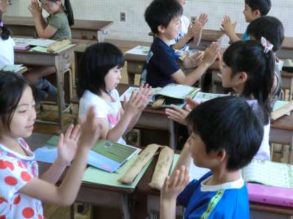 歌唱では「茶摘み」を歌っています。手合せをしながら,ペアのお友達と楽しそうに活動していました。