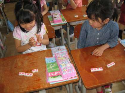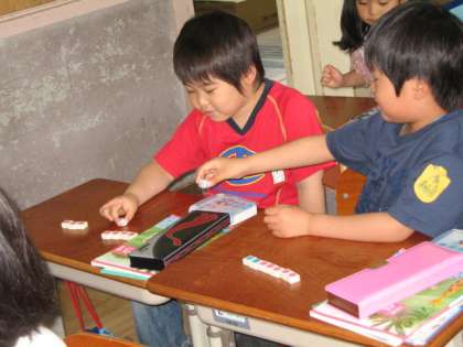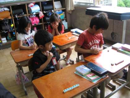 算数では,「7」になる数の合成や分解をしました。初めに数図ブロックを操作して「いくつといくつで7」を学習しました。そのあと,さいころを使って二人組でゲームです。まず一人がさいころを振り,でた数にいくつ足せば「7」になるか考えて二人目の人がさいころを振ります。うまく「7」になれば,二人目の人が勝ちになります。このゲームがとてもおもしろかったようで,終わりの会での1日の感想でも,「今日の算数がおもしろかったです。」と発表してくれました。
