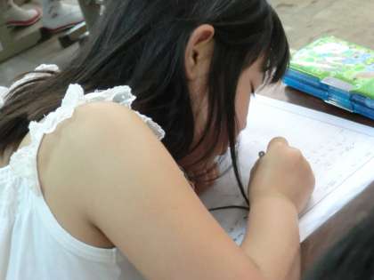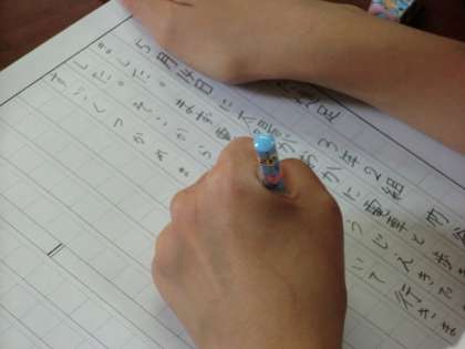 原稿用紙に,自分の心に残った出来事を書きます。○○で遊んだことが楽しかった,駅から40分くらい歩いてくたくたになった,など思いが次々に溢れている子どもたちです。本当に楽しかったのですね。