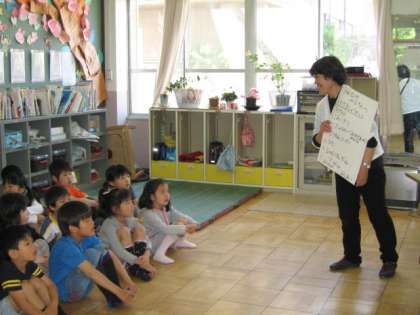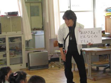 おひさま学級に一クラスずつ招待してもらいました。まず,おひさま学級の人が自己紹介してくれました。児童館で見かけたり,学校でも見かけたりしていたので知っている人もいました。その後,植田先生から「おひさま学級ってどんなクラス?」というお話をしてもらいました。それから,「おひさま学級では,どんな学習をしているのか」を話してくださいました。1年生の子ども達にわかりやすく「おひさま学級」のことを理解できるようにしていただきました。その後,みんなで「じゃんけんゲーム」をしました。楽しく過ごせた時間でした。