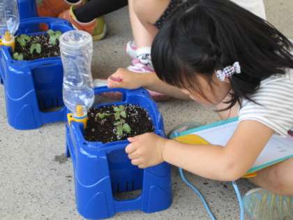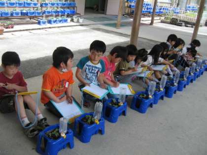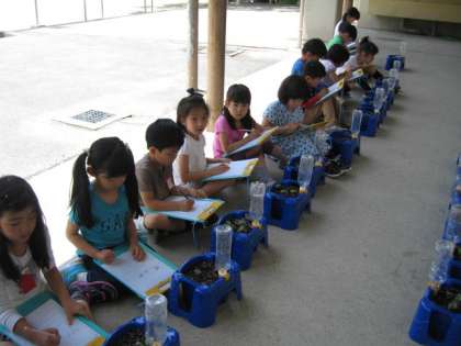 子ども達の植木鉢にもう朝顔の芽や双葉が出てきました。毎日みずやりをがんばっている子ども達。毎朝「先生!芽が出たよ!」「はっぱが出てきたよ!」と報告してくれます。そこで,生活の授業で,観察をしました。しっかり見ながら観察していた子ども達です。