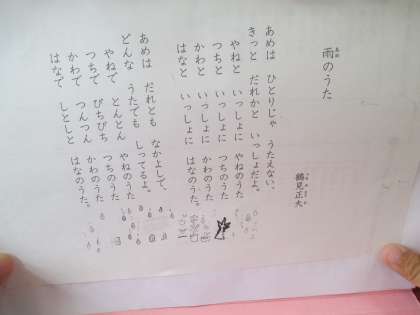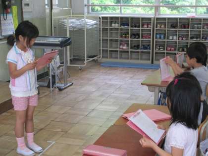 朝の時間に「読み声始めるよ。」と声をかけると,「今日は誰が前に出て読むのかな。」とうきうきしながら,読み声を始めます。間の取り方や読み方のリズムが子どもによって異なるので,同じ詩でも毎日新鮮に感じます。毎日読み声タイムを続けると,詩を憶える子どもも増えてきて,「紙がなくても読めるよ!」と楽しみながら取り組んでいます。