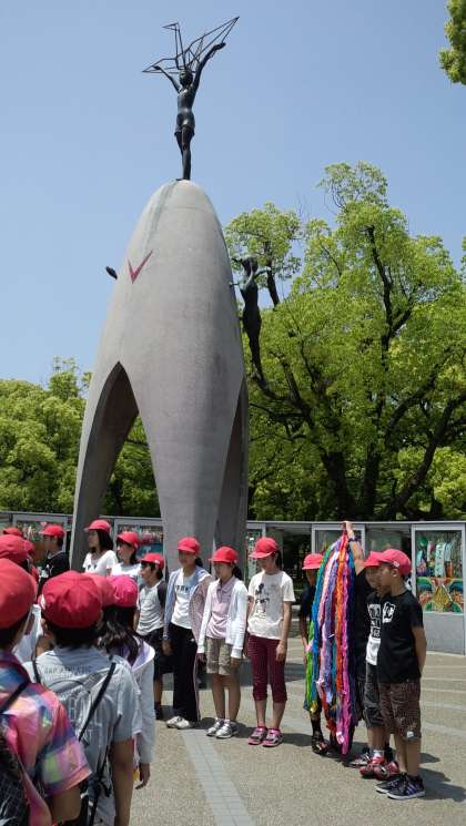被爆体験のお話を伺った後,平和集会を行いました。平和への祈りをこめて,1800羽の折鶴を捧げました。