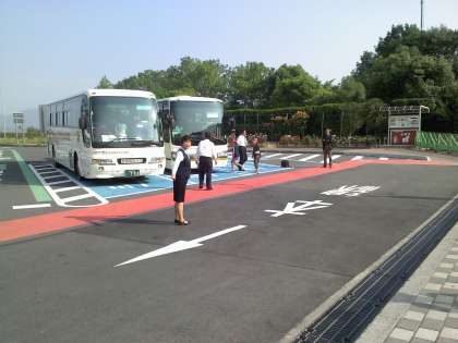 広島を離れ,バスに乗って岡山に向かっています。バスの中では,バスガイドさんの楽しいお話を聞きながら,誰も酔うこともなく、楽しく過ごしています。福山サービスエリアではトイレ休憩をとりました。