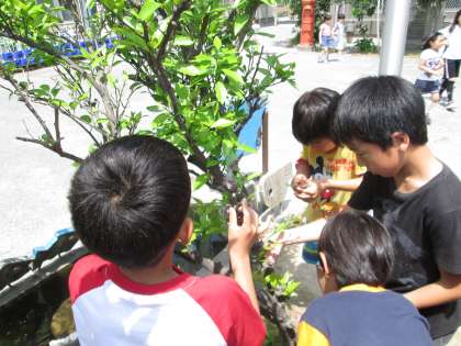 チョウの様子を観察しています。アゲハチョウは,初め黒色だった幼虫が,脱皮をして緑色に変化します。成長するにつれて変化していく様子に子どもたちも夢中です。