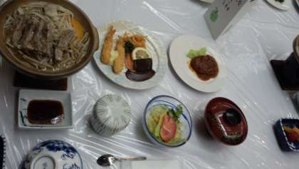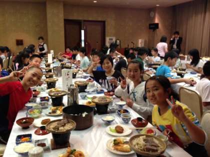 みんなそろって夕食をいただいています。「おいしそうなものばかり並んでいる!」と大興奮している子どもたちもいます。