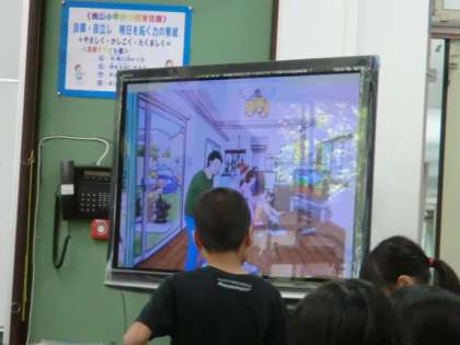 理科の岡本先生が,環境学習絵本「e絵本」を紹介してくださいました。教室,校庭,朝食,休日,町などの8つの場面の今と昔が比べられるようになっています。二人組で好きな場面を選択し環境について今と昔の違いを見つけます。