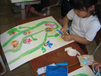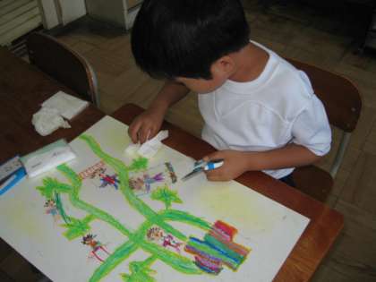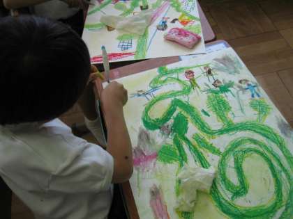図工で今取り組んでいるのは,日曜参観のときに掲示をする絵です。最後の仕上げにコンテで色をつけました。子ども達は初めてコンテを使う人が多く,大喜びです!はさみで削って落ちた粉をティッシュでのばします。きれいに仕上がるので,がんばって取り組んでいました。