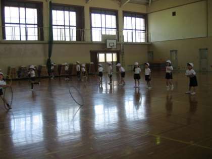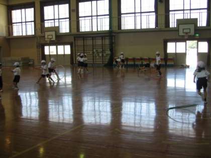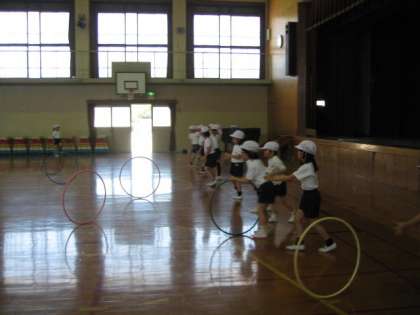 体育では,体育館でフラフープを使って運動しています。ずいぶん慣れてきて,フラフープを床で長く転がせるようになりました。二人組で受け取ったり,追いかけて取りにいったり,色々な運動をしました。二人組でなかよく活動できました。
