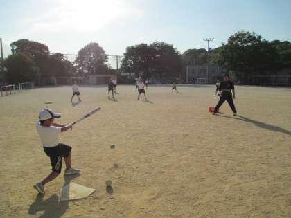 素振りをするときには,ボールをよく見て,まっすぐにバットを振ることを意識しています。遠くまで飛ばすことより,しっかりと素振りの姿勢ができるようになる練習をしています。