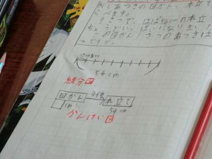 問題文からわかっていることやたずねていることを確認し,まずは線分図をかきました。線分図の描き方は忘れている人も多く,ひとつひとつ確かめながらかいていくと,その時点でもう式と答えが分かってきた人がいました。