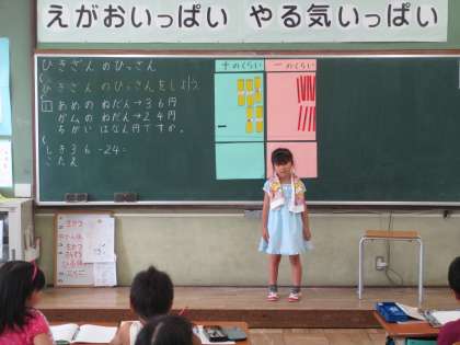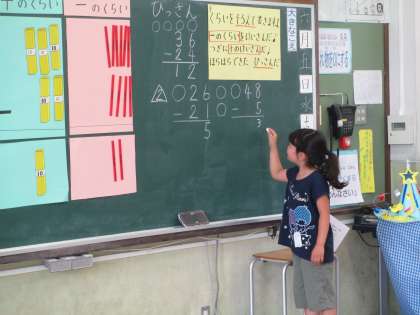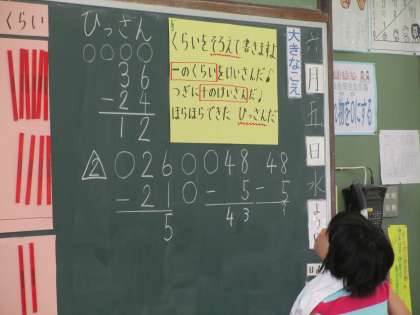 たし算の時と同じように,筆算のやりかたを前に出て説明しています。