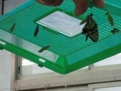 教室で育てているモンシロチョウ・アゲハチョウなどはぞくぞくとチョウになって外の世界へ羽ばたいていっていますが,まだまださなぎの状態のものがたくさんいます。毎日チョウになる様子が見られ,とても楽しみです。