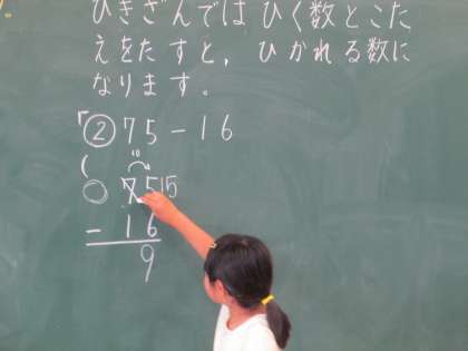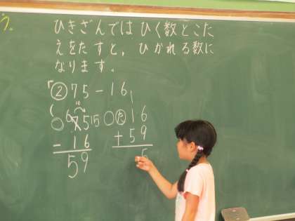 ひき算の答えの確かめ方は,ひく数と答えをたすということに気が付き,みんなで確認することができました。
