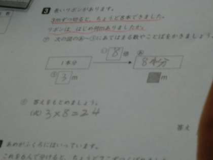 算数で学習した「かくれた数はいくつ」では,関係図をかくことで数量関係を捉え立式に結び付けることが大切です。復習プリントを使って何度も繰り返し問題に取り組み,慣れていきたいものです。