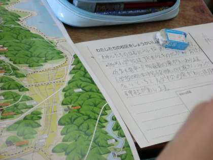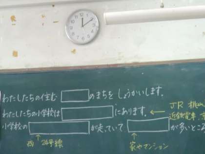 書き方に戸惑う人も多いので,どのような順で書けばよいか手本を参考にしながら「○○の西側に・・・」「○○の北側には・・・・」と校区や学校の場所を書きました。地図を広げ,京都市のどのあたりに桃山が位置するのかも確かめていました。