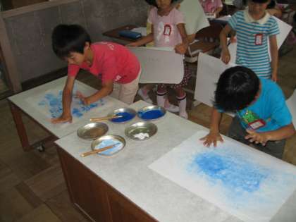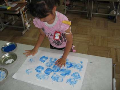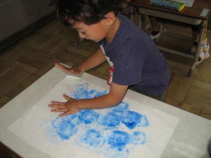 「みずあそび」の絵を描くために,今日はバックの絵をしあげました。プールの水の様子を表すために,ぬたくりをしました。まずは,画用紙を水で濡らします。そして,てのひらに絵の具をつけて,ぬたくりをします。初めての人も多かったようで,楽しんで取り組んでいました。