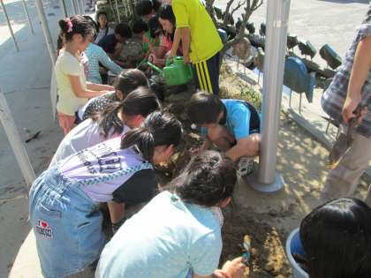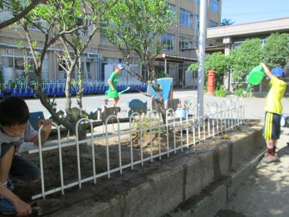 園芸委員会では,毎日の水やりをしたり,校内の花壇の管理をしたりしています。今月は,プランターの花を植えかえた後,花壇に柵を立てました。