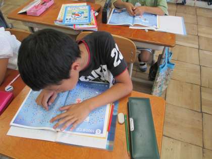 でも数えていくと,「うーん?いくつだったかたな?」ともう一度初めから数えたり,教科書の端の方に数を書いたりと工夫をしていました。