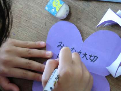 来週は6月のつどいです。全校,そして呉竹の友だちが集まってみんなで交流します。そのときに体育館を明るく飾るクラスのあじさい飾りを今日作っていました。