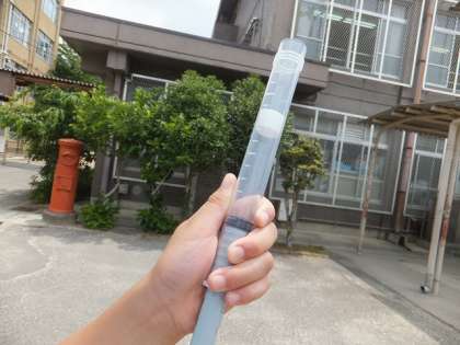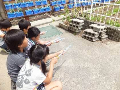 4年生は理科で空気の性質を学習しています。筒に空気を閉じ込め,押し棒で手前の玉を押すと前の玉が押し出されて飛び出します。高く飛ばしてみたり,的をねらったりして空気の性質を確かめました。