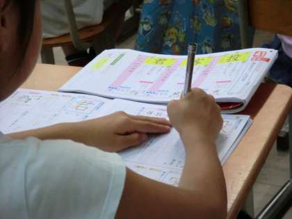 6校時,それでも姿勢を正して集中した空気のなかで漢字学習に励んでいる3年生です。