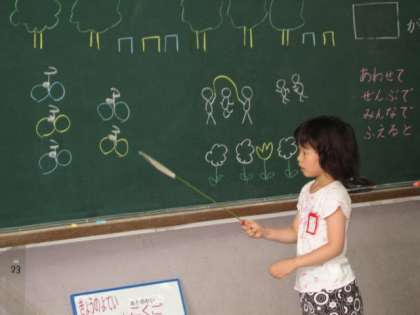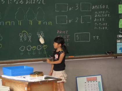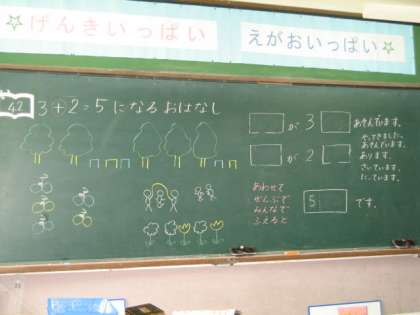たしざんの授業のまとめとして,「3+2=5」の式になるお話を作る取り組みをしています。子ども達にとって,問題を読んで立式するのではなく,自分が文章を作るのは,とても難しいようです。だから,話すパターンを決めて話しやすいようにしました。国語でも,友達に理由を説明したり,思ったことを説明したりしています。相手に伝える活動を色々な学習で取り組んでいます。