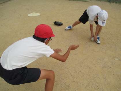 ゴロの取り方でも6年生に見本を見せてもらいました。しっかりと腰を下げて,丁寧にボールを取る練習をしていたので,5年生も見て練習をしました。