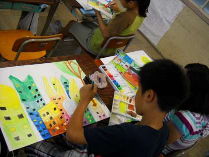 6年生は図画工作で「名前の町で」という作品に取り組んでいます。自分の名前のアルファベットの文字をもとにデザインしました。今は下絵にカラフルな着色をしている子が多いです。出来上がりが楽しみです。