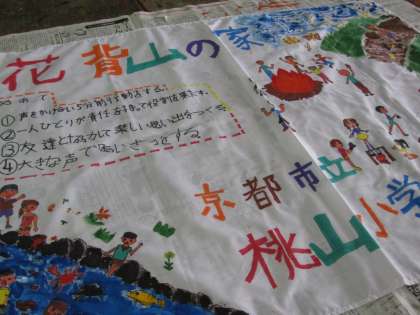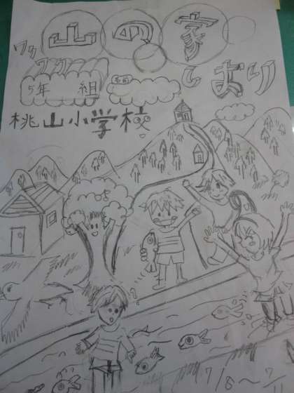 子ども達が頑張って作成したしおりの表紙の絵と旗が完成しました!