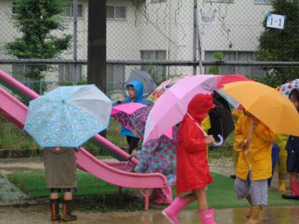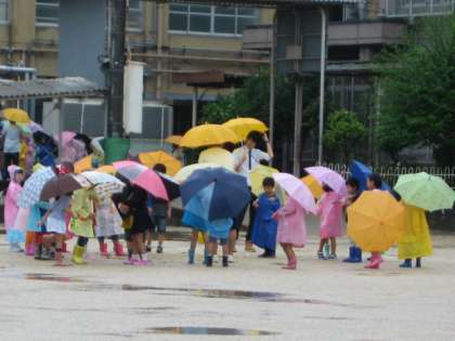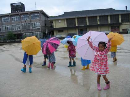 生活科では先週から「雨の日の様子」の観察をしたかったのですが,ずっといい天気で観察できませんでした。やっと雨が降ったので,今日観察することができました。降り具合も小雨で,運動場や中庭に出てもそんなに濡れることがありませんでした。木の葉の下に昆虫がいるかのぞいてみたり,みずたまりに落ちる雨粒の波紋を見たり,みずたまりにうつっているものをのぞいたり,鉄棒についている雨粒を見たりと,たくさん観察することができました。ふだんは,雨の日は運動場に出られないので子ども達は大喜びでした。