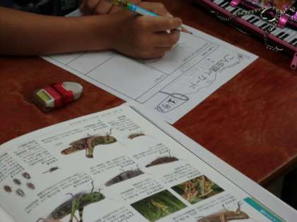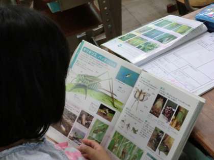 理科では,チョウの体のつくりに引き続き,こん虫を詳しく調べています。今日は図鑑などの資料を使って,調べました。姿,特徴,すんでいるところや主な食べ物などをワークシートにまとめていきます。