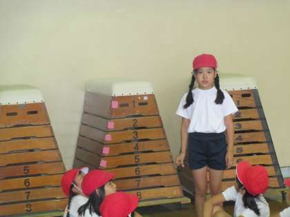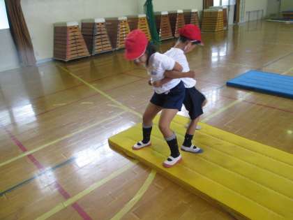 体育館で押し相撲をしました。2人組になって,お互いの力をぶつけあいました。マットから先に出たほうが負けになります。マットからでないための工夫を子どもたちが考え始め,「足で精一杯踏ん張るといいんだよ!!」とお互いにアドバイスをしていました。最後にはクラスの中の対戦をしました。勝ち負けにこだわることもなく,とても和やかな雰囲気の中で対戦ができていて,すごいなと思いました。