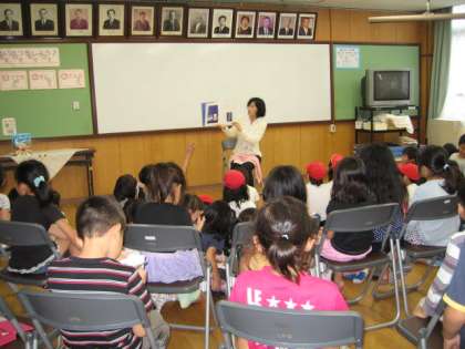 今日は,子ども達が楽しみにしている「お話玉手箱」がありました。雨が降っていることもあって,ふれあいサロンは,満員でした。熱心に話を聞いていた子ども達です。