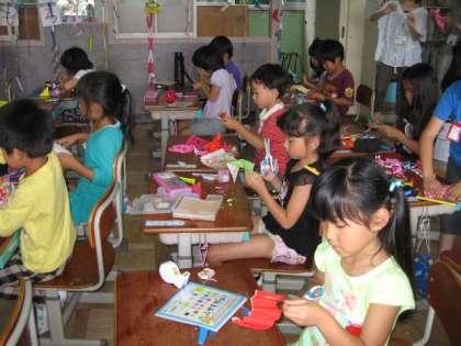 図工では,折り紙を使って色々な飾りを作りました。もうすぐ七夕ですね。ちょうど七夕飾りにも使えるように,切り方を学習しました。4つのパターンを一つずつ切ってみました。はさみの使い方もちょうどいい機会なので,指導しました。すてきな飾りができるたびに歓声があがりました。今日作った飾りは,教室の窓がわにぶらさげました。きれいですね。