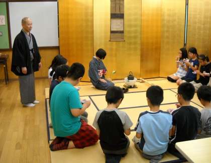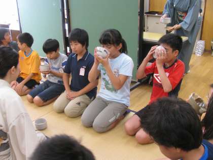 学校公開日の2日目。6年生は茶道教室に参加しました。栄春寺のご住職に茶道の歴史やお茶の心についてのお話を聞きました。その後お茶席が用意されたふれあいサロンでお菓子とお抹茶をいただきました。金屏風や畳,お手伝いいただいた保護者の方々の着物姿。ほっこりした時間が流れました。子どもたちは「あじさい」のお菓子もお抹茶もとてもおいしかったようです。また,お茶道具もたくさん見せていただき,子どもたちは熱心にメモをとっていました。