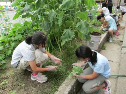 7月の園芸委員会では,夏休みの計画を立てたり、花壇の手入れをしたりしました。夏休みも当番として,学校の花壇の水やりに取り組みます。また,花壇の雑草をていねいに抜いたり,プランターの花を入れ替えたりしました。
