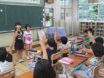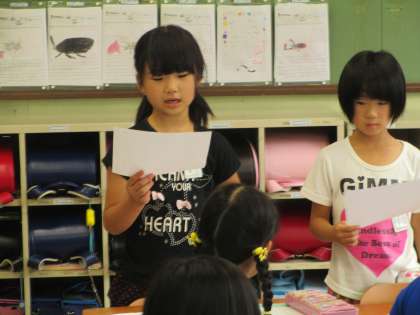 朝の会では,日直のスピーチを続けています。今日は休みの日のできごとをスピーチしていました。日直さんのスピーチが終わると,質問タイムがあります。4月にくらべ,どんどん質問をする人が増えています。また読み声タイムでは,大きく口を開けている人に前に出てもらっています。読み声の目的は,大きく口をあけてはっきりと読むことです。上手に読んでいる友だちの様子を見て,だんだんと口が大きく開くひとが増えました。毎日の積み重ねを大切に,続けていきたいです。